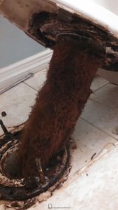 The only thing we could figure was the schefflera trees that the previous owner planted along the foundation had sent roots under the slab. It seemed a little far for the roots to grow but they are tenacious trees. We found a crack in the mounting flange that allowed the roots to grow up inside the trap of the toilet. Yup, pretty gross! and that was just what was in the drain line, we couldn’t remove what was up inside the toilet trap.